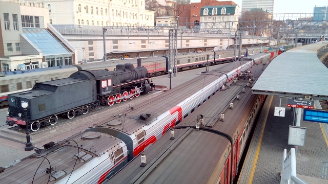 『ロシア』号はこのシベリア鉄道全線を走破する看板列車で、モスクワのヤロスラフスキー駅 とウラジオストック駅を、6泊7日をかけて運行され、世界で最も長い距離を走る国内列車となっています。編成は日によって異なる場合もあるようですが、概ね10~16両程度、現在は2等級製で食堂車も連結されています。出発日によっては途中駅まで(から)の車両や、北朝鮮・中国からの車両も連結されて運行されます。ちなみに、世界最長距離を走る列車はこの北朝鮮・ピョンヤン―モスクワを結ぶ国際列車で、その走行距離は実に10,214㎞、ピョンヤン行きは9泊10日をかけ運行されます。
