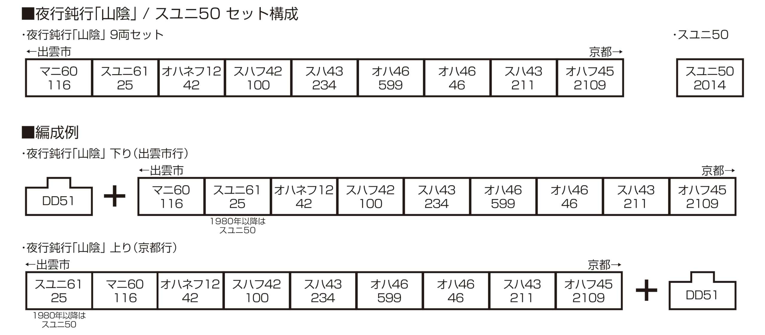 - KATO10-1879夜行鈍行「山陰」 9両セット25,300円寝台客車を連結した夜行普通列車 国鉄時代の山陰本線を走った「山陰」は、京都~出雲市間386.2kmを結んだ夜行の普通列車です。普通列車ながらB寝台車が連結されており、このB寝台座席を座席管理・発券のマルスシステムで予約できるようにするために「山陰」の愛称が与えられました。編成は荷物車、郵便荷物車、10系B寝台車、43系座席客車で組成され、DD51が牽引しました。運行区間によって最終列車・始発列車・通勤通学列車・ローカル列車など様々な性格をもち、また沿線地域への郵便・荷物輸送の役割もあり、往年の山陰本線の人・モノの往来を支えました。主な特長